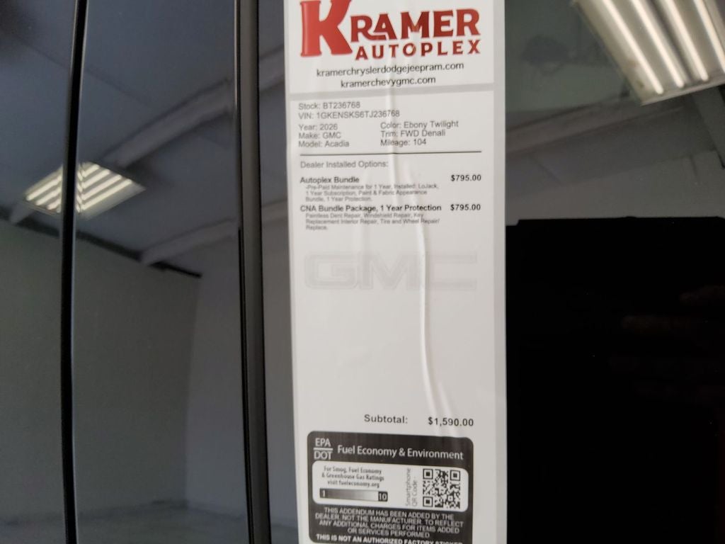 The GMC Acadia has auto-adjust speed for safe following. This unit is pure luxury with a heated steering wheel. This 2026 GMC Acadia offers Apple CarPlay for seamless connectivity. Start this model from inside with remote start. The vehicle's Lane Departure Warning keeps you safe by alerting you when you drift from your lane. See what's behind you with the back up camera on this 2026 GMC Acadia . The GMC Acadia stays safely in its lane with Lane Keep Assist. The installed navigation system will keep you on the right path. This 1/2 ton suv is equipped with the latest generation of XM/Sirius Radio. It features a hands-free Bluetooth® phone system. This GMC Acadia offers Android Auto for seamless smartphone integration. The leather seats in it are a must for buyers looking for comfort, durability, and style. This model is painted with a sleek and sophisticated black color. Enjoy the convenience of the power liftgate on this GMC Acadia.