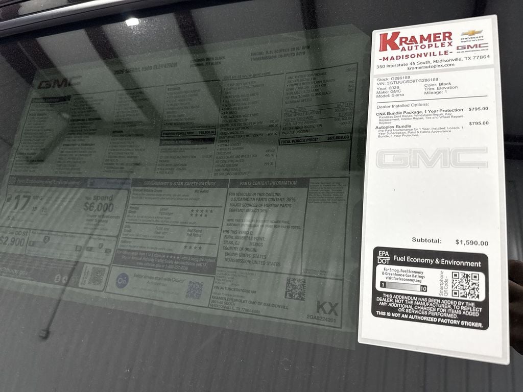 Discover the 2026 GMC Sierra 1500 Elevation 4WD — a bold, capable pickup ready for work and weekend adventures in Madisonville, TX. Powered by a robust 5.3L V8 gasoline engine mated to a smooth automatic transmission, this GMC Sierra delivers confident towing, strong acceleration and efficient highway cruising. The Elevation trim blends rugged style with thoughtful technology, offering Navigation for stress-free routing and Apple CarPlay for seamless smartphone integration on every drive. Inside, Automatic Climate Control keeps the cabin comfortable for driver and passengers, while the Back-Up Camera enhances safety and maneuverability in tight spaces. Advanced driver aids include Lane Departure Warning to help maintain your lane during long hauls or daily commutes. The GMC Sierra's durable bed and smart storage options provide practical utility for hauling gear, tools or recreational equipment, and 4WD capability ensures traction and control across Texas terrain and varying weather. This 2026 GMC Sierra 1500 Elevation is competitively priced and touted as the best price in the area, offering exceptional value for a low-mileage, feature-rich pickup located in Madisonville, TX. Whether you need a dependable work truck or a comfortable daily driver with serious capability, this GMC Sierra elevates performance, technology and safety. Schedule a test drive today and experience why this GMC Sierra 1500 stands out in its class.