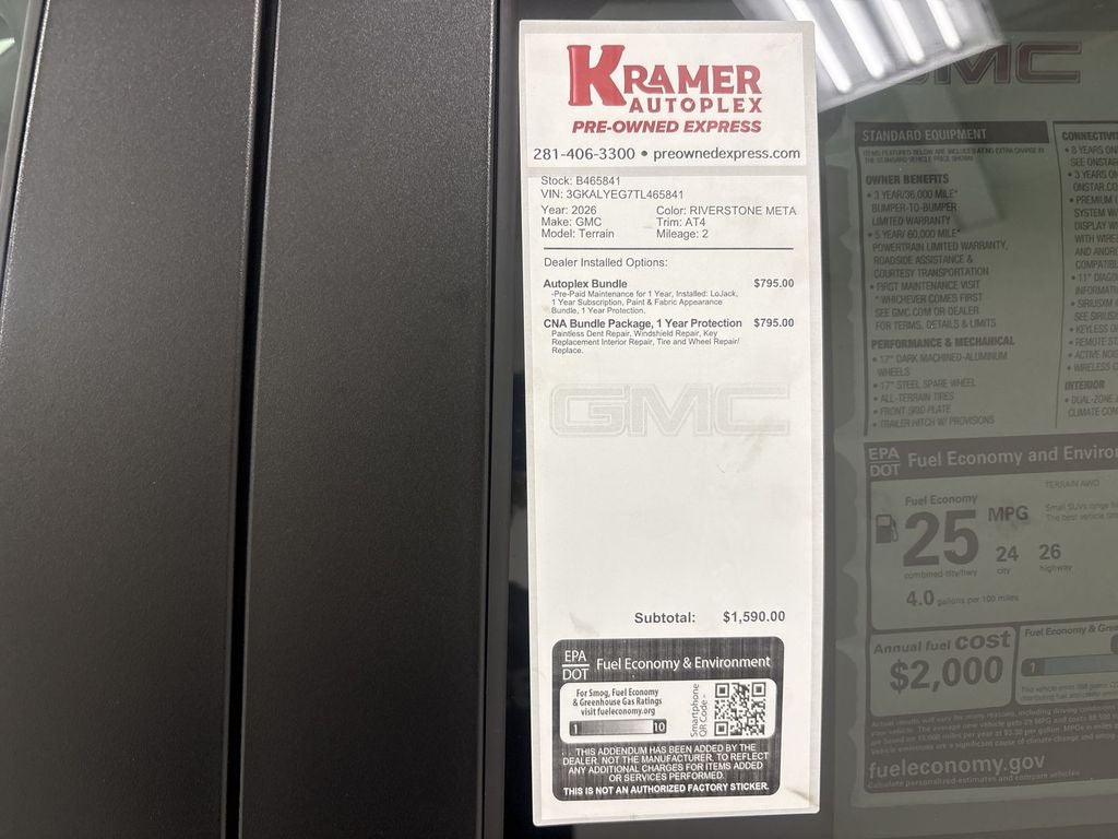 See what's behind you with the back up camera on the vehicle. Never get into a cold vehicle again with the remote start feature on this mid-size suv. Keep your hands warm all winter with a heated steering wheel in this GMC Terrain . This 2026 GMC Terrain 's Lane Departure Warning keeps you safe by alerting you when you drift from your lane. This model has automated speed control that adjusts to maintain a safe following distance, enhancing highway driving convenience. The installed navigation system will keep you on the right path. This mid-size suv stays safely in its lane with Lane Keep Assist. The leather seats in this model are a must for buyers looking for comfort, durability, and style. This GMC Terrain features a hands-free Bluetooth® phone system. This 2026 GMC Terrain emanates grace with its stylish gray exterior. Load groceries and much more with ease into it thanks to the power liftgate.