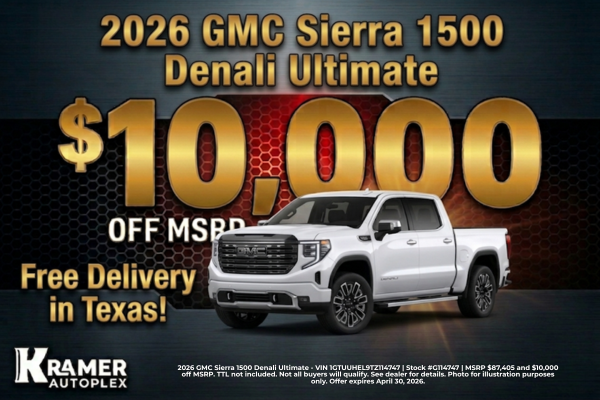 2026 GMC Sierra 1500 Denali Ultimate - VIN 1GTUUHEL9TZ114747 | Stock #G114747 | MSRP $87,405 and $10,000 off MSRP. TTL not included. Not all buyers will qualify. See dealer for details. Photo for lustration purposes only. Offer expires April 30, 2026.