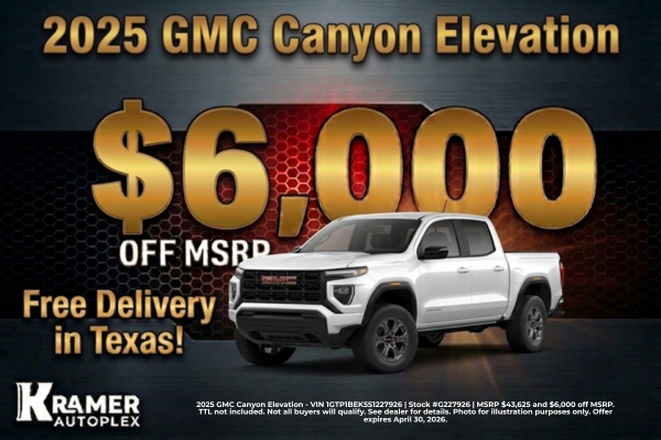 2025 GMC Canyon Elevation - VIN 1GTP1BEK5S1227926 | Stock #G227926 | MSRP $43,625 and $6,000 off MSRP. TTL not included. Not all buyers will qualify. See dealer for details. Photo for illustration purposes only. Offer expires April 30, 2026.