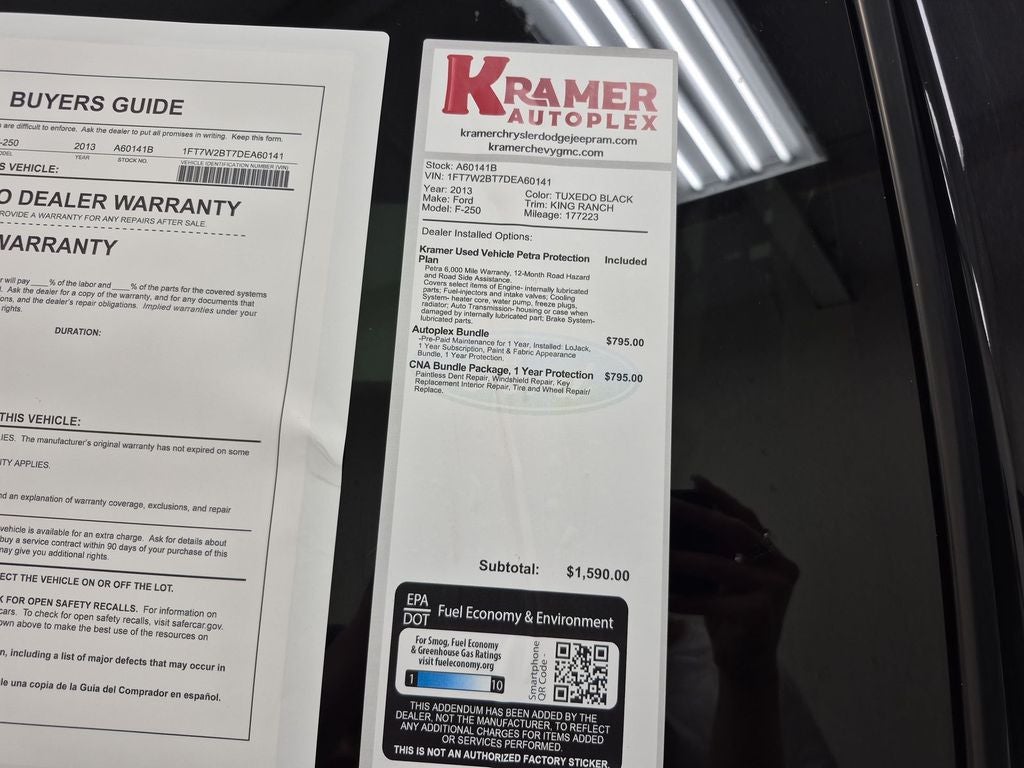 King Ranch with Chrome Package: King Ranch Chaparral Leather-Wrapped Steering Wheel; PowerScope Trailer-Tow Mirrors; Body-Color Lower Bodyside Moldings; Universal Garage Door Opener; Accent Color Front Bumper; Navigation System with HD and Satellite Broadcast; Memory Power Adjustable Pedals; Unique King Ranch Leather 40/console/40 Front Seats; Remote Start System; Unique Chrome Mirror Caps; 6" Angular Chrome Step Bars; Accent Color Rear Bumper with Step Pad; Chrome Exhaust Tip; Painted Body Color Grille with Chrome Insert; Unique Door Trim Panels. Order Code 608A: 10. 000 Lb Payload Package GVWR; Premium Sony Audio with Single CD. LT275/65Rx20E OWL A/T (4) Tires. 20" Chrome Clad Cast Aluminum Wheels. Navigation System with HD and Satellite Broadcast. Electronic Locking with 3.55 Axle Ratio. Remote Start System. Universal Garage Door Opener. Upfitter Switches (4). Bodyside Molding. **Equipment listed is based on original vehicle build and subject to change. Please confirm the accuracy of the included equipment by calling the dealer prior to purchase.**