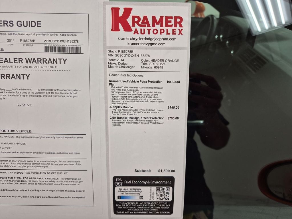 This unit features a hands-free Bluetooth® phone system. This mid-size car has satellite radio capabilities. This 2014 Dodge Challenger keeps you comfortable with Auto Climate. This 2014 Dodge Challenger has a clean CARFAX vehicle history report. This model shines like the sun with a vibrant orange exterior finish. Enjoy the incredible handling with the rear wheel drive on this unit. Quickly unlock this vehicle with keyless entry. Set the temperature exactly where you are most comfortable in this mid-size car. The fan speed and temperature will automatically adjust to maintain your preferred zone climate. This vehicle has a V8, 6.4L high output engine. This mid-size car comes with a manual transmission. Electronic Stability Control is one of many advanced safety features on the vehicle. Help alleviate lower back pain with the driver seat lumbar support in this Dodge Challenger. The Dodge Challenger is equipped with a gasoline engine. This mid-size car features cruise control for long trips.
