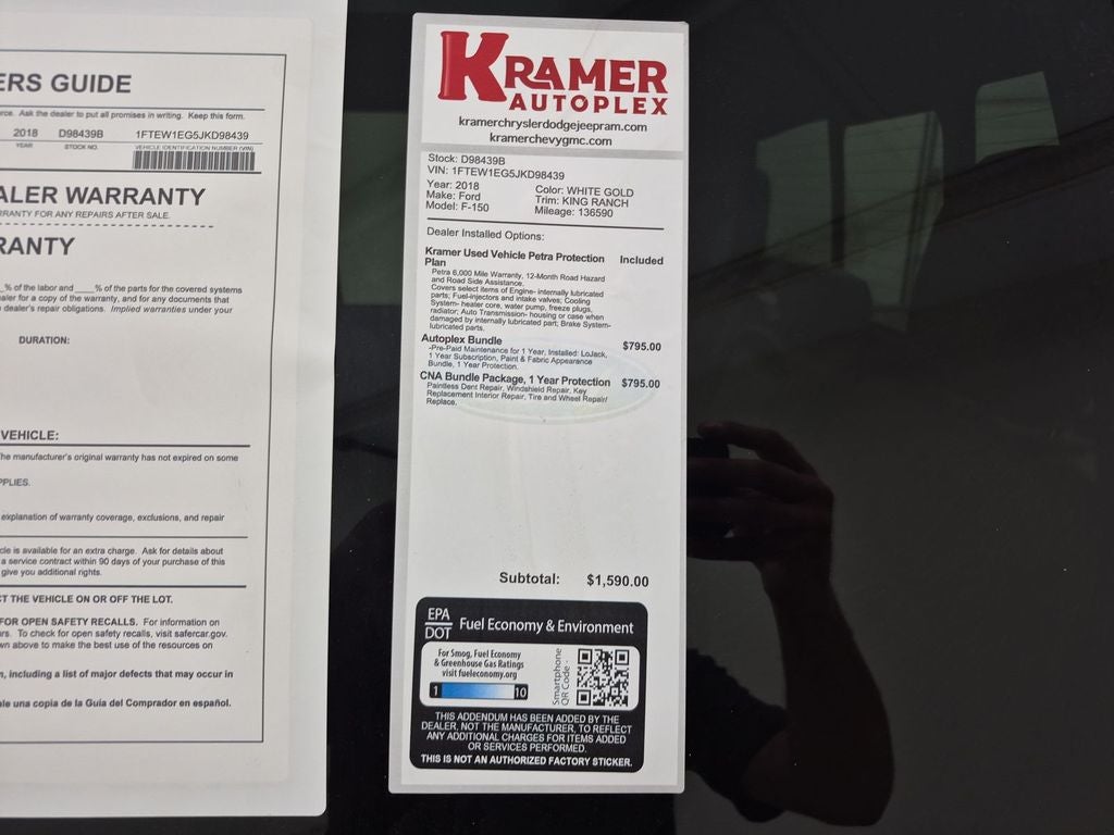 Equipment Group 600A Base: B&O Play Premium Audio System; Electronic 10-Speed Automatic Transmission; King Ranch Leather Bucket Seats. Twin Panel Moonroof. 20" Machined-Aluminum Wheels. Extended Range 36 Gallon Fuel Tank. Electronic Locking with 3.31 Axle Ratio. Tailgate Step with Tailgate Lift Assist. Box Side Steps. Wheel Well Liner. **Equipment listed is based on original vehicle build and subject to change. Please confirm the accuracy of the included equipment by calling the dealer prior to purchase.**