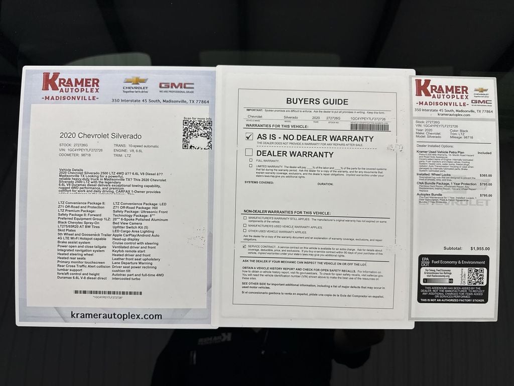 2020 Chevrolet Silverado 2500 LTZ 4WD — 6.6L V8 Diesel — Madisonville TX Looking for a powerful, reliable heavy-duty truck in Madisonville TX? This 2020 Chevrolet Silverado 2500 LTZ with the legendary 6.6L V8 Duramax diesel delivers exceptional towing capability, rugged 4WD performance, and premium comfort for work and daily driving. CARFAX 1-Owner provides added confidence in the vehicle's history. This Chevrolet Silverado features leather seats, a high-end interior, and advanced technology including Android Auto, built-in Navigation, and Hands-Free Bluetooth® for seamless connectivity on the road. Equipped for serious tasks, the diesel V8 offers impressive torque and towing capacity, making it ideal for hauling trailers, equipment, or boats. The LTZ trim adds chrome accents, upgraded wheels, and interior refinements that elevate both appearance and comfort. Whether you need a dependable fleet truck or a capable personal hauler, this Chevrolet Silverado combines capability with convenience. Located in Madisonville TX, this truck is priced to sell and represents the best price in the area for comparable diesel 2500 LTZ models. Schedule a test drive today to experience the performance and luxury of this Chevrolet Silverado 2500 LTZ. Don't miss your chance to own a well-maintained, CARFAX 1-Owner heavy-duty truck with premium features and proven diesel power.
