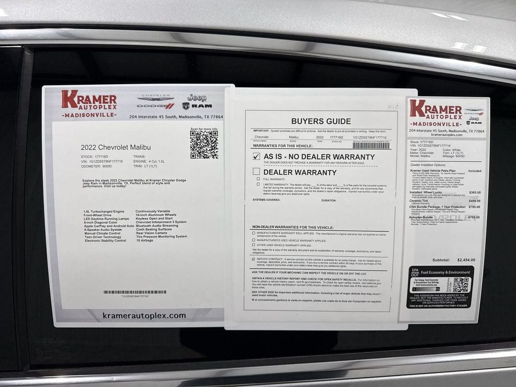2022 Chevrolet Malibu LT — Reliable, efficient midsize sedan in Madisonville, TX. This clean CARFAX-report vehicle pairs a fuel-sipping 1.5L 4-cylinder gasoline engine with smooth FWD handling, making it an ideal daily driver for commuters and families. You'll appreciate the modern convenience features: Remote Start for quick climate control on hot or cool days, Automatic Climate Control to keep cabin comfort steady, Hands-Free Bluetooth® for safe, seamless calls and audio streaming, and a Back-Up Camera to simplify parking and tight maneuvers. This Chevrolet Malibu LT combines smart styling with practical performance and excellent fuel economy, delivering confident highway cruising and responsive city driving. The interior offers comfortable seating, intuitive controls, and a well-laid-out infotainment system for everyday usability. The vehicle's CARFAX Clean Report provides added peace of mind about its history and maintenance. Located in Madisonville, TX, this 2022 Chevrolet Malibu LT is competitively priced — the best price available — ensuring outstanding value compared with similar local listings. Whether you're searching for dependable transportation or a comfortable commuter sedan, this Chevrolet Malibu stands out for quality, features, and affordability. Contact us to schedule a test drive or request additional vehicle details and take advantage of this exceptional offer today.