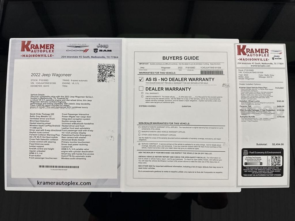 Discover exceptional value with this 2022 Jeep Wagoneer Series I, located in Madisonville, TX. Powered by a robust 5.7L V8 gasoline engine and rear-wheel drive, this Jeep Wagoneer delivers confident performance and a refined highway presence while offering the utility and comfort expected from a full-size SUV. The Series I trims provide upscale appointments and smart technology for daily driving and longer road trips.