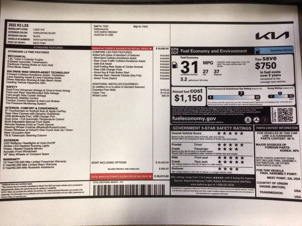 2022 Kia K5 LXS - pristine example of style, efficiency, and value located in Livingston, TX. Powered by a responsive 1.6L 4-cylinder gasoline engine with front-wheel drive, this Kia K5 delivers a balanced blend of fuel economy and confident highway performance. The LXS trim pairs smart technology with driver-focused features, making daily commutes and longer trips more connected and comfortable. Interior connectivity includes Apple CarPlay and Android Auto for seamless smartphone integration, plus Hands Free Bluetooth® for safe, convenient calling and audio streaming. Safety is emphasized with Lane Departure Warning and Collision Avoidance systems that help you stay aware and in control on busy roads. Thoughtful creature comforts and ergonomic seating ensure an enjoyable ride for driver and passengers alike. This Kia K5 is priced competitively to offer the best value in the area-an exceptional option for buyers seeking quality without compromise. Well-maintained and ready for immediate delivery in Livingston, TX, this vehicle provides the modern features you want at a price that fits your budget. If you're searching for a reliable sedan with contemporary tech, safety systems, and efficient performance, this 2022 Kia K5 LXS is a standout choice. Contact us to schedule a test drive and see why this Kia K5 represents smart buying in the Livingston market.