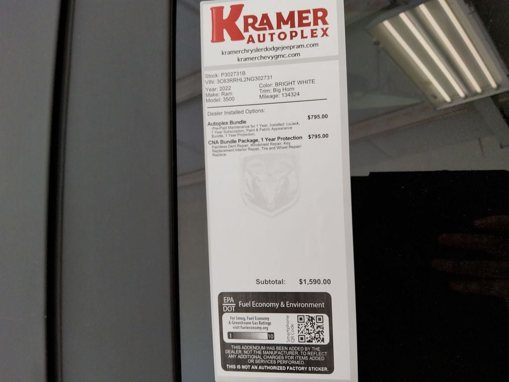 Quick Order Package 2HZ Big Horn. Dual Rear Wheels: Bright Wheel Skins; Clearance Lamps; LT235/80R17E BSW AS Tires; 17" Steel Spare Wheel; Box and Rear Fender Clearance Lamps; Center Hub; 17" X 6.0" Steel Chrome Clad Wheels; 6000# Front Axle with Hub Extension; 14. 000 lbs GVWR; Rear Wheelhouse Liners. Quick Order Package 2GZ Big Horn. Chrome Flat Cab-Length Side Steps. MOPAR Spray in Bedliner. 5th Wheel/gooseneck Towing Prep Group. Rear Wheelhouse Liners. Clearance Lamps. **Equipment listed is based on original vehicle build and subject to change. Please confirm the accuracy of the included equipment by calling the dealer prior to purchase.**