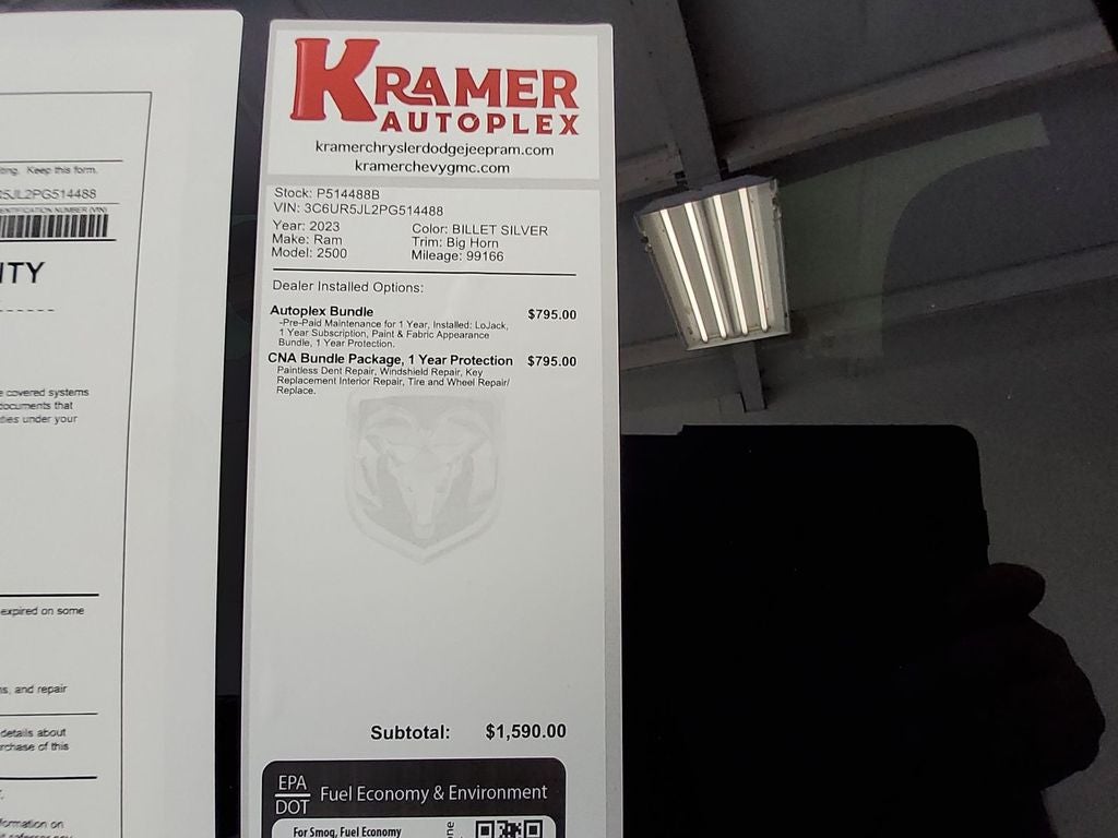 Protect it from unwanted accidents with a cutting edge backup camera system. This unit has a clean CARFAX vehicle history report. Apple CarPlay: Seamless smartphone integration for this vehicle - stay connected and entertained on the go! This unit comes equipped with Android Auto for seamless smartphone integration on the road. Bluetooth® technology is built into the Ram 2500, keeping your hands on the steering wheel and your focus on the road. This vehicle has satellite radio capabilities. with XM/Sirus Satellite Radio you are no longer restricted by poor quality local radio stations while driving it. Anywhere on the planet, you will have hundreds of digital stations to choose from. This 2023 Ram 2500 gleams with an elegant silver clear coated finish. Greater towing safety becomes standard with the installed trailer brake. This model has four wheel drive capabilities. This 2023 Ram 2500 has a 6 Cyl, 6.7L high output engine.