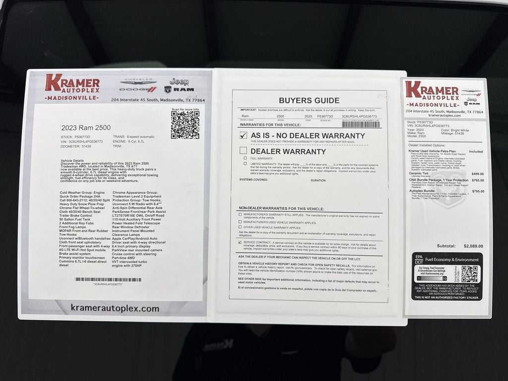Located in Madisonville, TX, this Ram 2500 Tradesman is competitively priced and advertised as the best price in the area — a strong value for buyers seeking power and dependability. With solid service records and practical tech, it's ready to work the moment you drive away. Contact us today to schedule a test drive or request more information. Don't miss your chance to own a powerful, budget-smart diesel pickup in Madisonville.