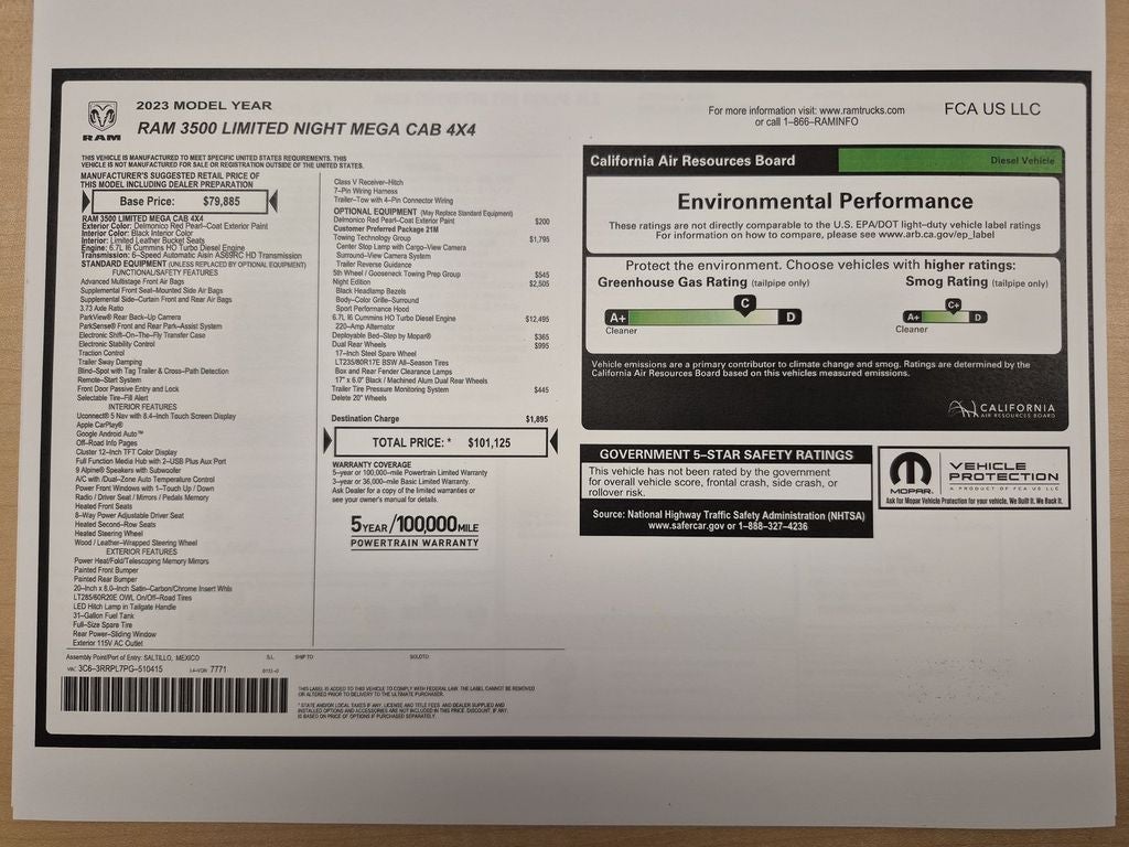 Quick Order Package 21M Limited. Night Edition: Black Exterior Truck Badging; 17" X 6.0" Black Machined Aluminum Wheels; Black Ram Head Tailgate Badge; Body Color Grille Surround; Black Headlamp Bezels; Sport Performance Hood; Black Grille Limited; Black Wheel Center Hub; Black Tail Lamp Bezels. Towing Technology Group: Center Stop Lamp with Cargo View Camera; Surround View Camera System; Trailer Reverse Guidance. Dual Rear Wheels: Clearance Lamps; LT235/80R17E BSW AS Tires; 17" Steel Spare Wheel; Box and Rear Fender Clearance Lamps; Center Hub; 6000# Front Axle with Hub Extension; Dual Rear Wheel Fender Flare Tracking; 14. 000 lbs GVWR. 5th Wheel/gooseneck Towing Prep Group. Trailer Tire Pressure Monitoring System. MOPAR Deployable Bed Step. Center Stop Lamp with Cargo View Camera. Delmonico Red Pearlcoat. Clearance Lamps. **Equipment listed is based on original vehicle build and subject to change. Please confirm the accuracy of the included equipment by calling the dealer prior to purchase.**