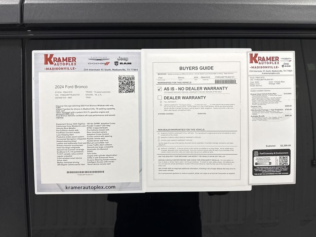 Located in Madisonville, TX, this Ford Bronco Wildtrak is competitively priced and advertised as the best price in the area — an exceptional value for a low-mileage, feature-rich model. Whether you crave off-road performance or daily driving comfort, this 2024 Ford Bronco Wildtrak is an outstanding option. Contact us to schedule a test drive or request additional vehicle details and the CARFAX report. Act quickly — low-mileage Ford Broncos with these features don't stay available long.