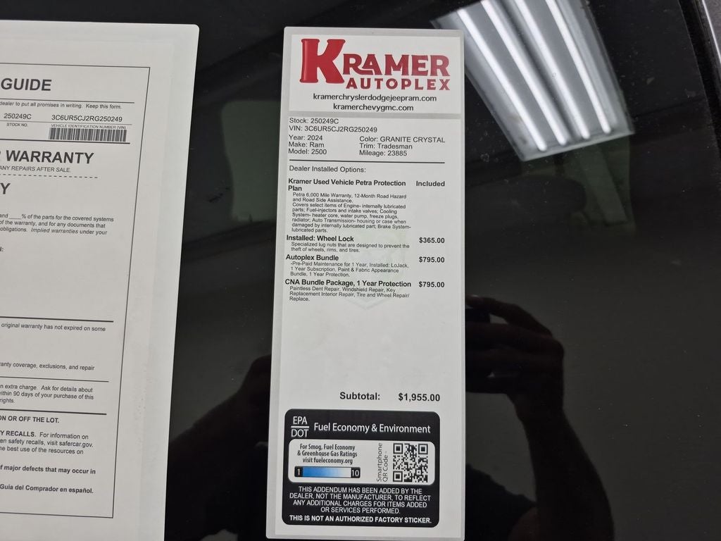 Chrome Appearance Group: Bright Rear Bumper; Chrome Grille Surround; Matte Black Mesh Grille with Chrome; Center Hub; Chrome Headlamp Bezels; 18" Steel Spare Wheel; 18" X 8.0" Steel Chrome Clad Wheels; Bright Front Bumper. Convenience Group: Rear View Auto Dim Mirror; Air Conditioning ATC with Dual Zone Control; Tinted Acoustic Windshield Glass. Quick Order Package 2GA Tradesman. Tradesman Level 2 Equipment Group: SiriusXM Radio Service; Rear Window Defroster; For More Info. Call 800-643-2112; 40/20/40 Split Bench Seat; Rear Power Sliding Window; Manual Folding Exterior Mirrors; Rear Folding Seat; 4 Way Front Headrests; Front Armrest with Cupholders; Exterior Mirrors with Heating Element; Remote USB Port - Charge Only; Manual Adjust 4-Way Front Passenger Seat; Mirror Running Lights; Black Exterior Mirrors; 2 Way Rear Headrest Seat; Carpet Floor Covering; Power Adjustable Convex Aux Mirrors; Cloth 40/20/40 Bench Seat; Power Heated Folding Telescope Mirrors; Exterior Mirrors with Supplemental Signals; Exterior Mirrors Courtesy Lamps; Manual Adjust 4-Way Driver Seat; Manuarl Telescoping Mirrors; Power Adjust Mirrors. Protection Group: Tow Hooks; Transfer Case Skid Plate Shield. Uconnect 5 Navigation Radio with 8.4" Display. Anti-Spin Differential Rear Axle. Cloth 40/20/40 Bench Seat. Trailer Brake Control. LT275/70R18E OWL On/off Road Tires. ParkSense Rear Park Assist System. Granite Crystal Met CC. Power Heated Fold Telescope Mirrors. Rear Window Defroster. Carpet Floor Covering. Tow Hooks. Clearance Lamps. **Equipment listed is based on original vehicle build and subject to change. Please confirm the accuracy of the included equipment by calling the dealer prior to purchase.**