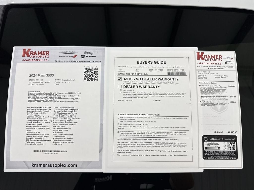 Discover exceptional capability with this pre-owned 2024 Ram 3500 Big Horn, located in Madisonville, TX. Powered by a robust 6-cylinder 6.7L diesel engine and equipped with 4WD, this heavy-duty pickup delivers the towing strength and reliability you need for demanding jobs or weekend adventures. With just 44,155 miles and CARFAX 1-Owner history, this Ram 3500 offers proven care and value.