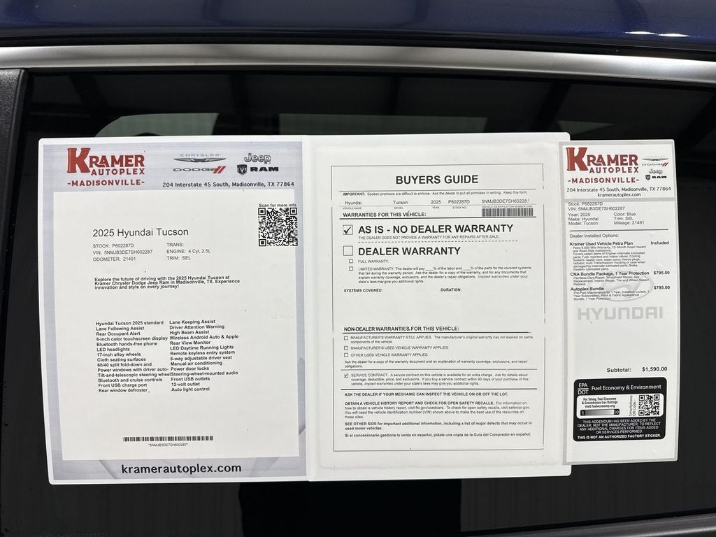 Find exceptional value with this 2025 Hyundai Tucson SEL, a stylish and practical compact SUV located in Madisonville, TX. With only 21,491 miles, this low-mileage Hyundai Tucson combines modern features and efficient performance from its 4-cylinder 2.5L gasoline engine and smooth front-wheel drive. Clean CARFAX history and CARFAX 1-Owner status give you confidence in its maintained condition and ownership background. Inside, the Hyundai Tucson SEL is equipped for daily convenience and connectivity. Seamless smartphone integration through Android Auto and Apple CarPlay keeps navigation, calls, and media at your fingertips. The back-up camera enhances safety and parking ease, making maneuvering in tight spots more manageable. Comfortable seating and thoughtful interior appointments create an enjoyable ride for drivers and passengers alike. This Hyundai Tucson SEL is competitively priced to offer the best deal in the area, combining low mileage, desirable features, and a clean vehicle history. Whether you need a reliable commuter vehicle, a family crossover, or a stylish weekend cruiser, this Hyundai Tucson delivers value without compromise. Located in Madisonville, TX, it's ready for a test drive today. Contact us to schedule an appointment or request the CARFAX report and more details on this exceptional 2025 Hyundai Tucson SEL.