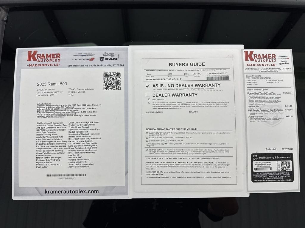 Discover exceptional value with this 2025 Ram 1500 Lone Star, now available in Madisonville, TX. This rugged 4WD pickup pairs a capable V6 3.6L gasoline engine with a smooth ride and confident towing capacity, delivering the reliability and performance you expect from a Ram. With only 9,278 miles, this low-mileage truck is an outstanding opportunity for buyers seeking near-new condition without the new-vehicle price.